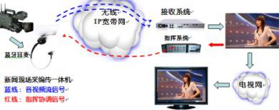 指挥系统服务器放置在演播中心,客户端为蓝牙或USB耳麦。耳麦通过USB或蓝牙与1TMT8900系列Casper视频采编传一体机连接。